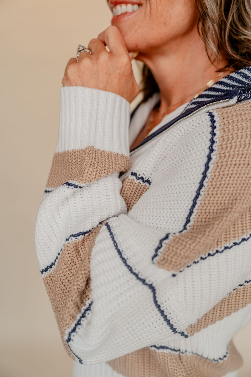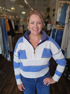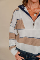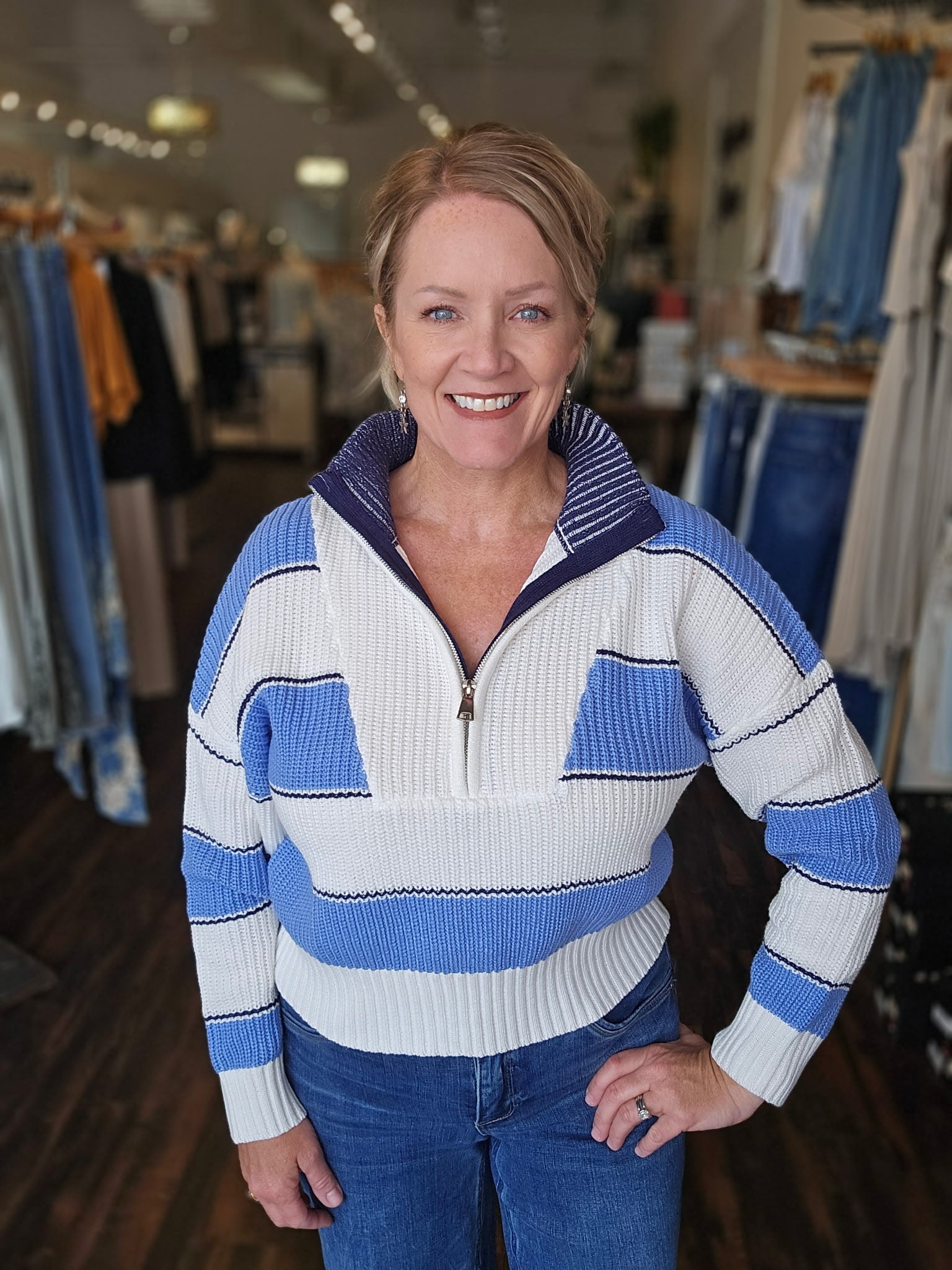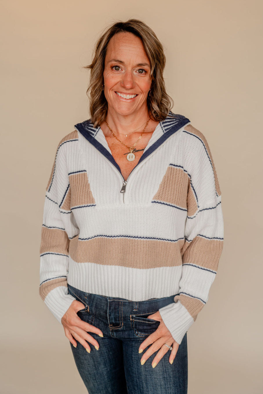 Stay cozy and stylish with this 1/4 Zip Striped Sweater! Its playful stripes add a fun twist to your casual look, while the convenient quarter-zip lets you adjust your comfort level with ease. Perfect for layering or wearing solo, this sweater brings a splash of personality to any outfit.