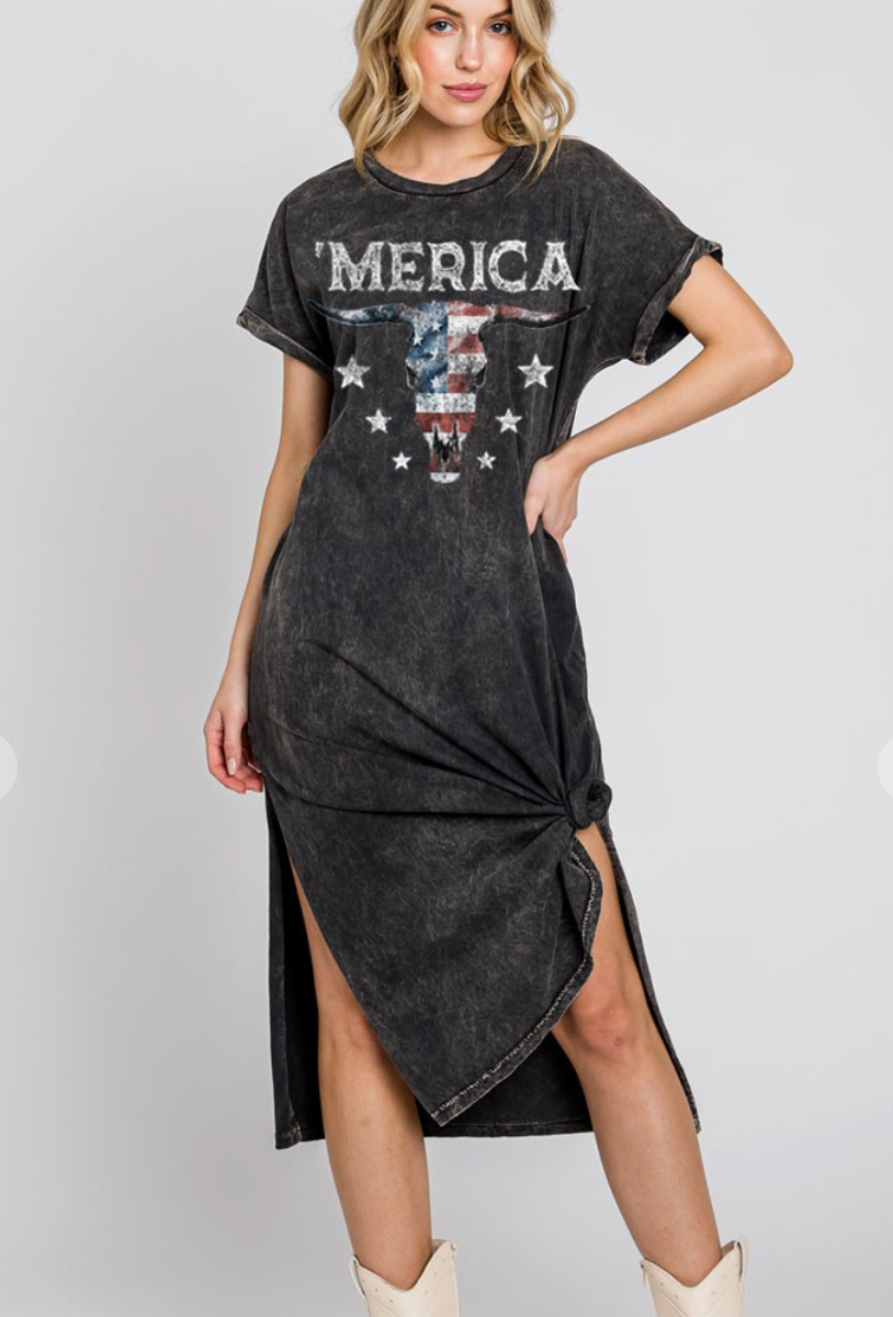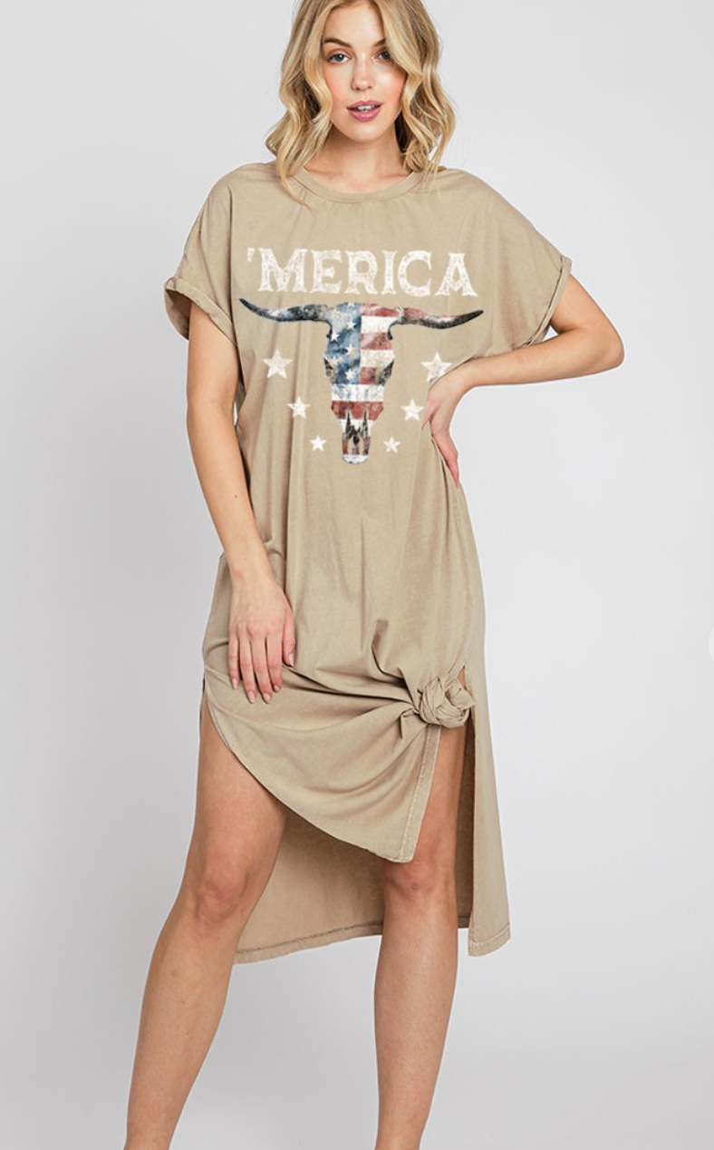 100% Cotton MERICA graphic knee length dress w/ tacked sleeves & side slits