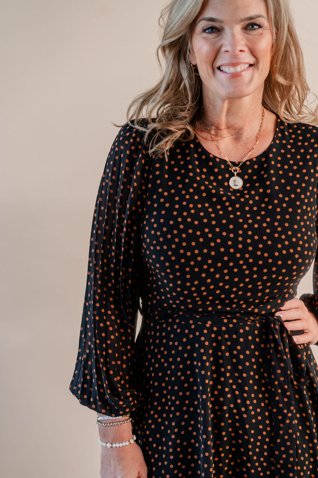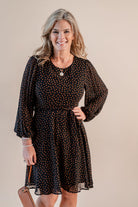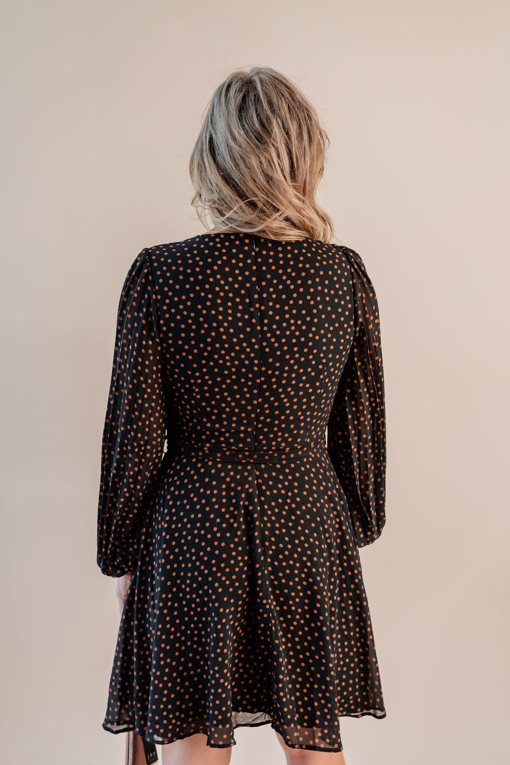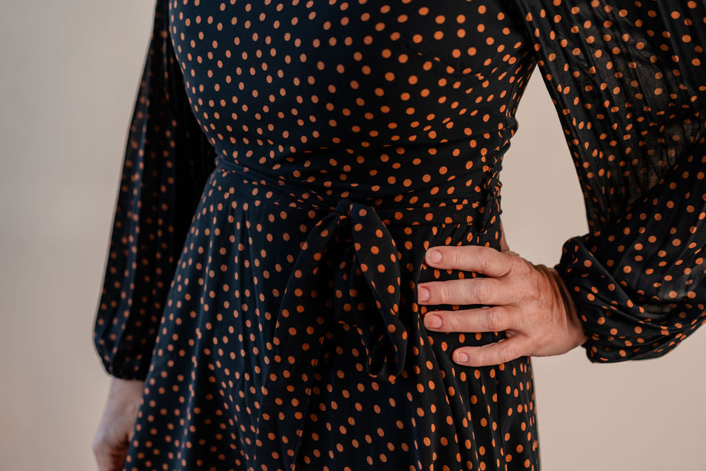 182-Apricot Pleated Sleeve Polkadot Dres