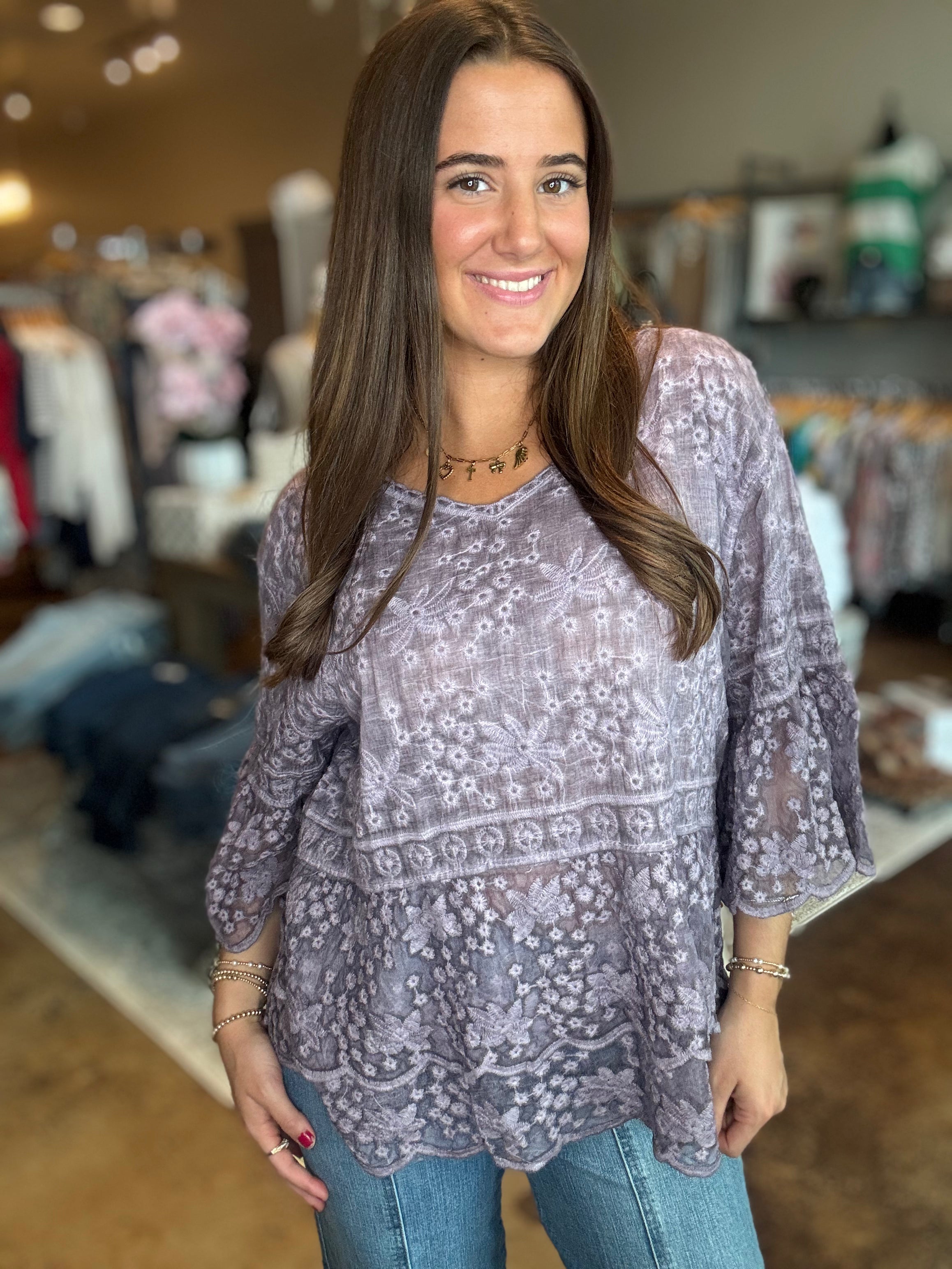 Embrace timeless elegance with our 3/4 Bell Sleeve Lace Top. Featuring delicate lace detailing and flowing bell sleeves, it offers a feminine silhouette that's perfect for layering or wearing solo. Ideal for both casual outings and dressier occasions, this top brings effortless charm to any ensemble. Pair it with denim for a relaxed look or dress it up with a skirt for a more polished appearance.