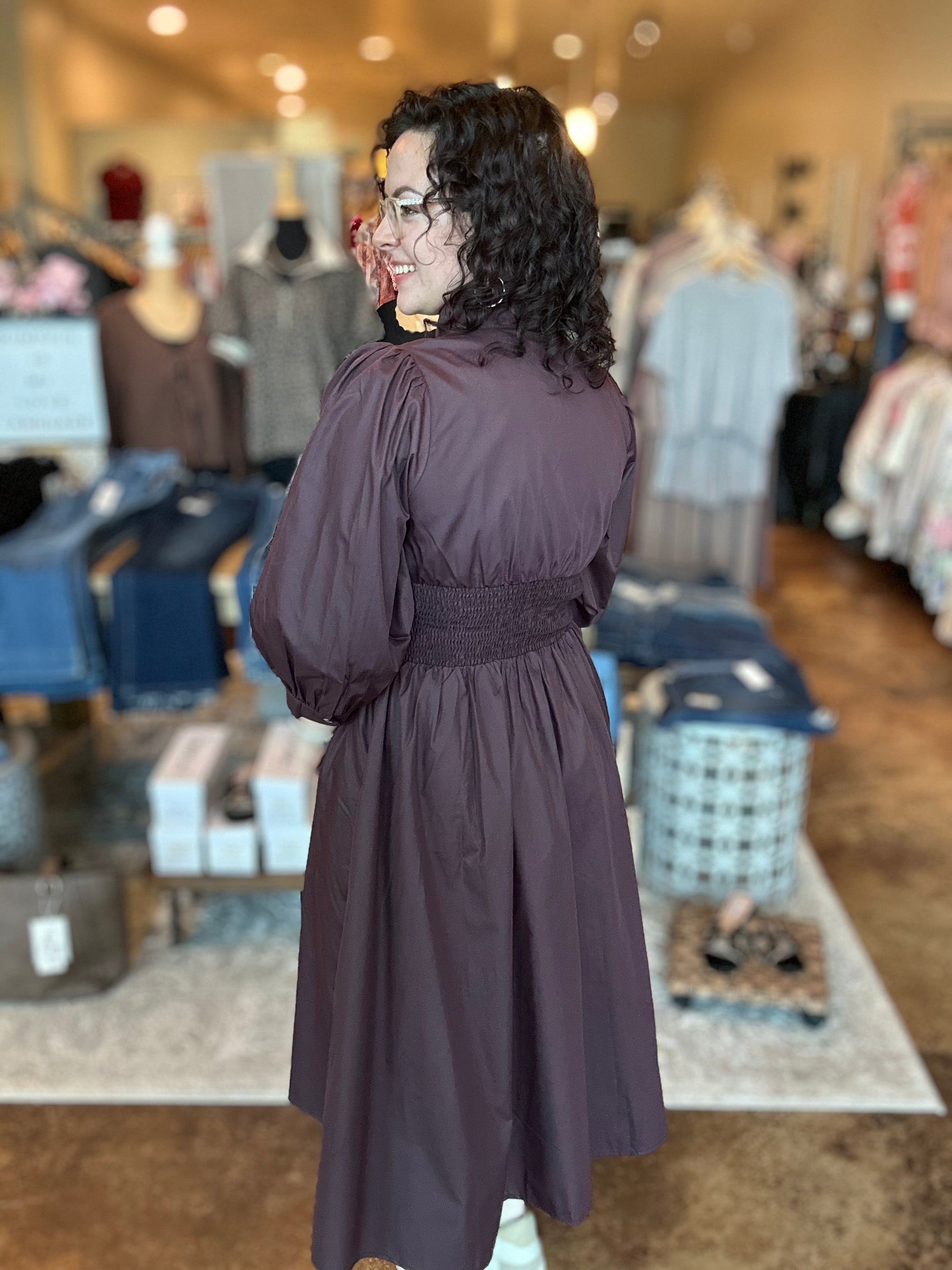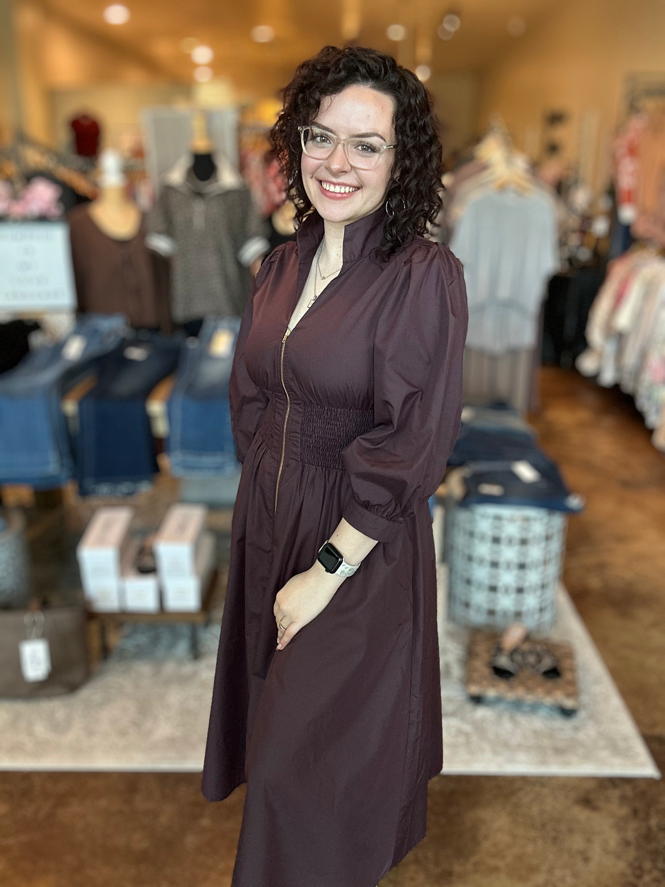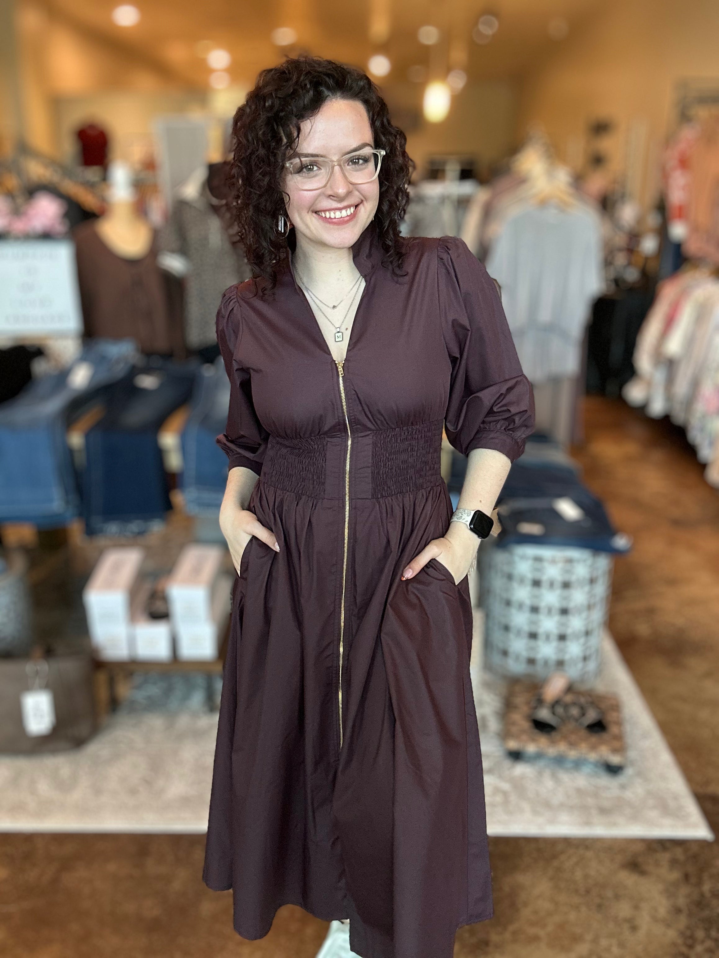 Timeless with a modern twist, our 3/4 Sleeve Front Zip Midi Dress is your new go-to for effortless elegance. Featuring a flattering v-neckline and soft 3/4 puff sleeves, it’s finished with delicate button cuffs for a touch of refinement. The smocked waist adds definition and comfort, creating a beautifully cinched silhouette. Designed with a front zip closure and convenient side pockets, this dress blends femininity with function. Perfect for dressing up or down, depending on the moment.