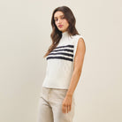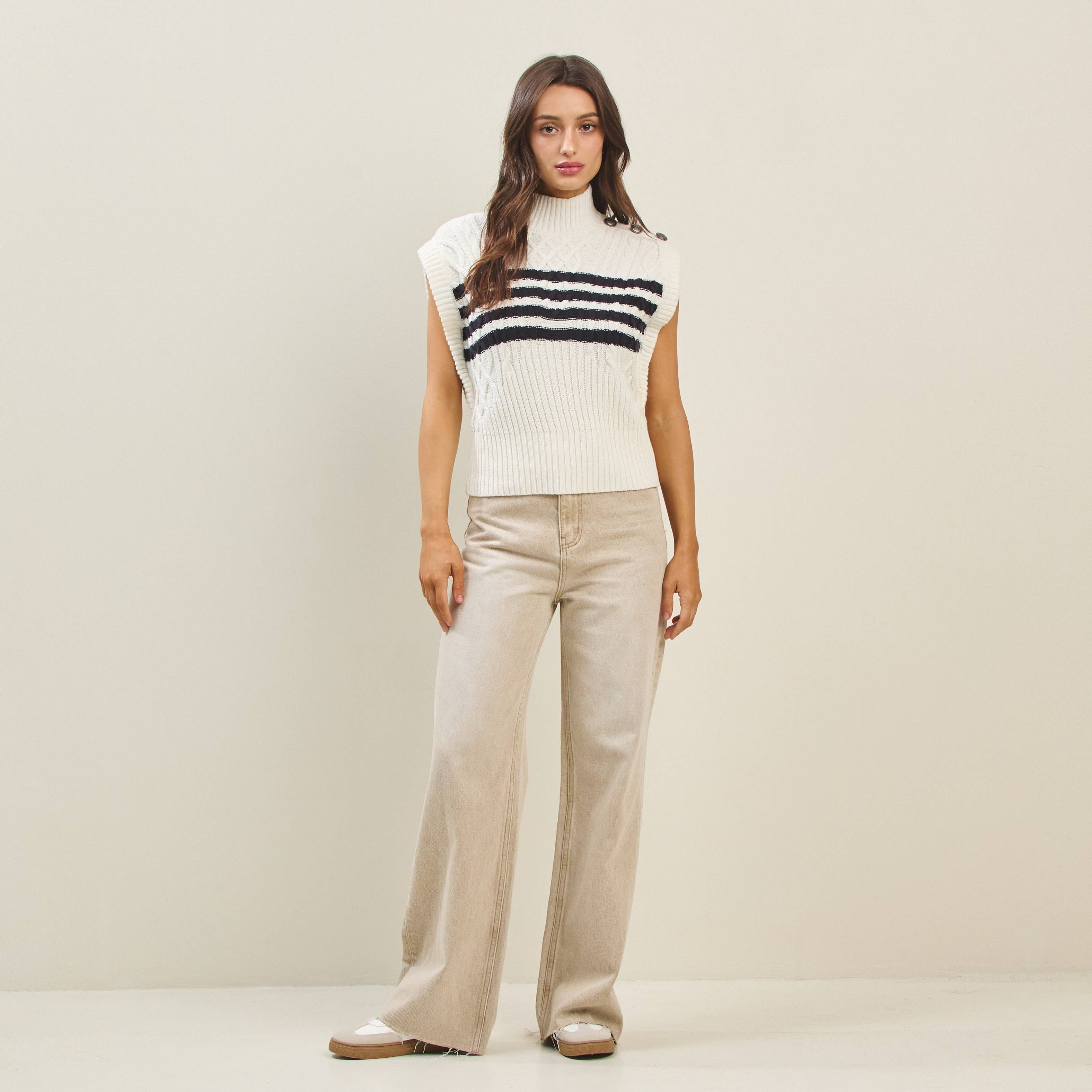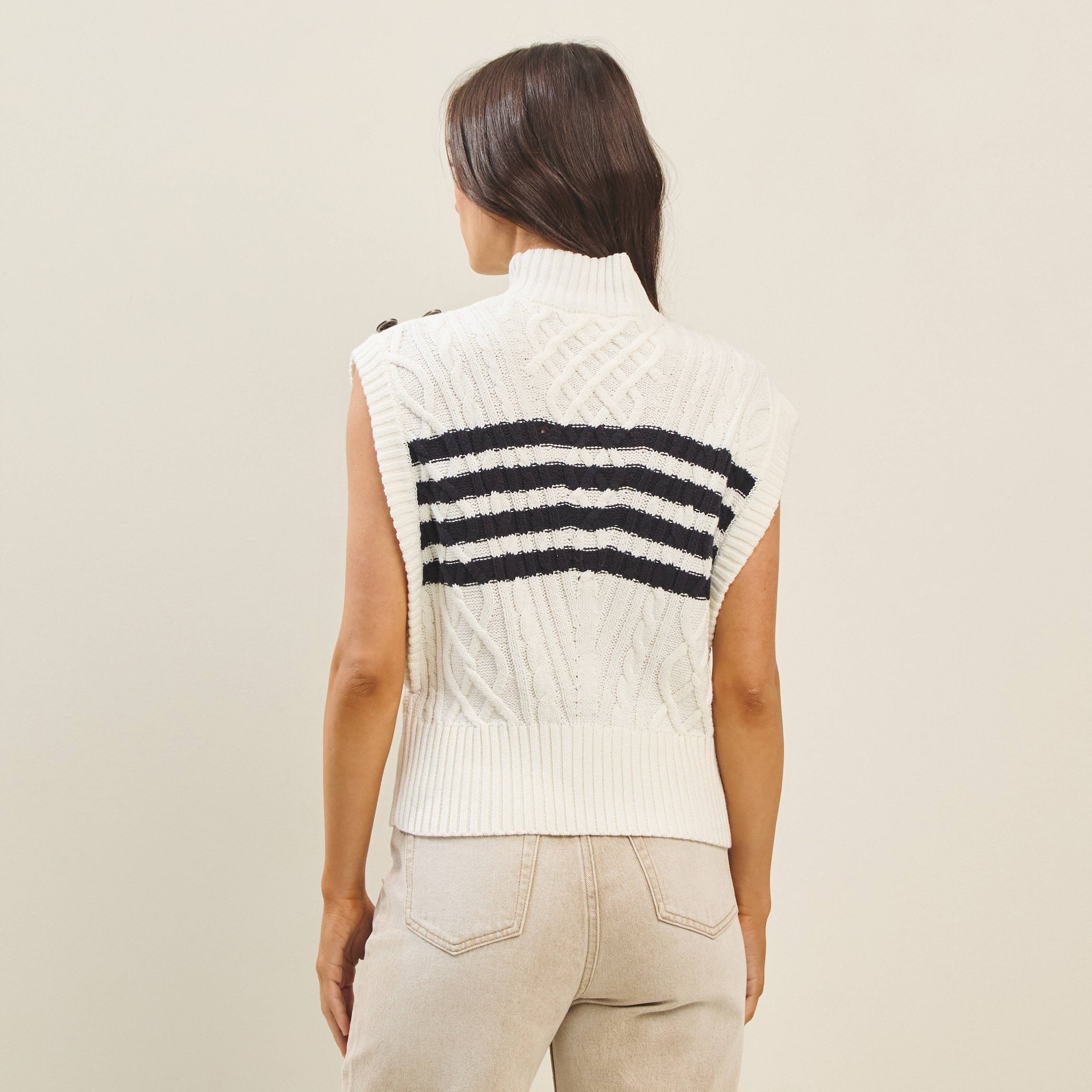 Cozy up in this Able Striped Button Sweater Vest, featuring classic ivory and navy stripes with playful button details. Perfect for layering over your favorite tops, it adds a fun twist to any outfit while keeping you warm and stylish. Embrace sweater vest charm with a modern, cheerful vibe! 60%Cotton, 40% Acrylic.