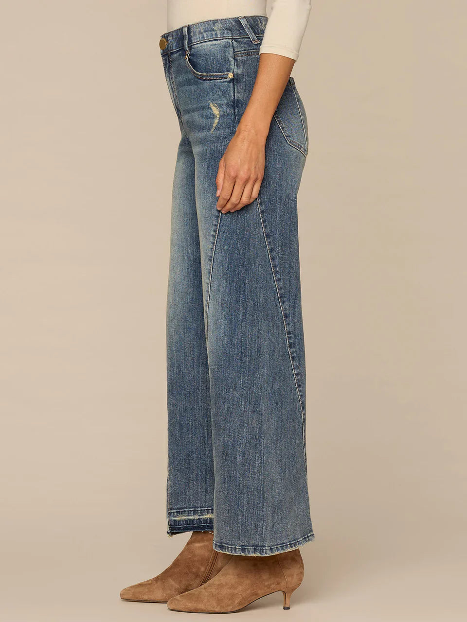These Wide Leg jeans are fitted through the hips with a relaxed, wide opening through the legs. Engineered with "Ab"solution® fit technology to smooth, support, and enhance your shape—giving you everything from a flatter tummy to a perkier rear view—as well as a broken yoke and uneven release step hem.