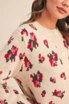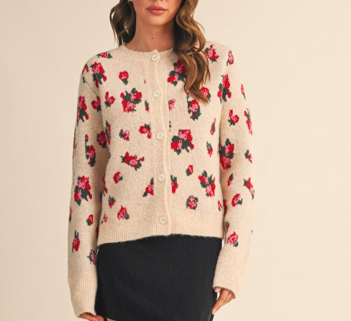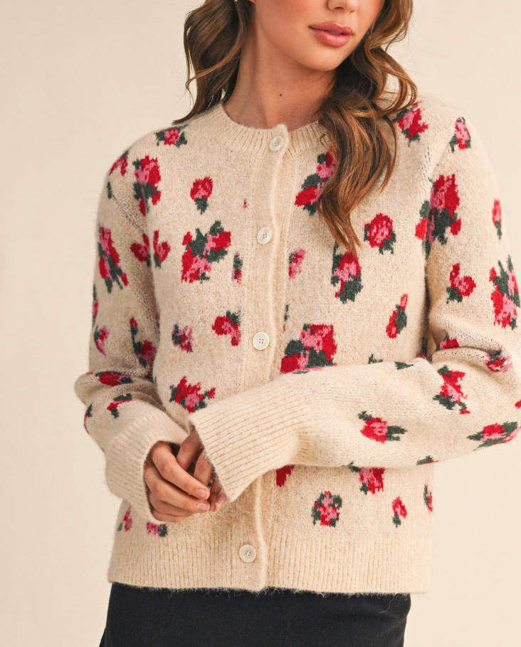 + Abstract floral sweater cardigan + Ribbed round neckline with button-down placket + All-over abstract floral knit design + Long sleeves with ribbed cuffs + Waist length cardigan