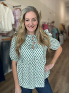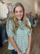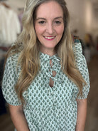 Abstract Print Top with Front Ribbon Tie & Ruffle Details
