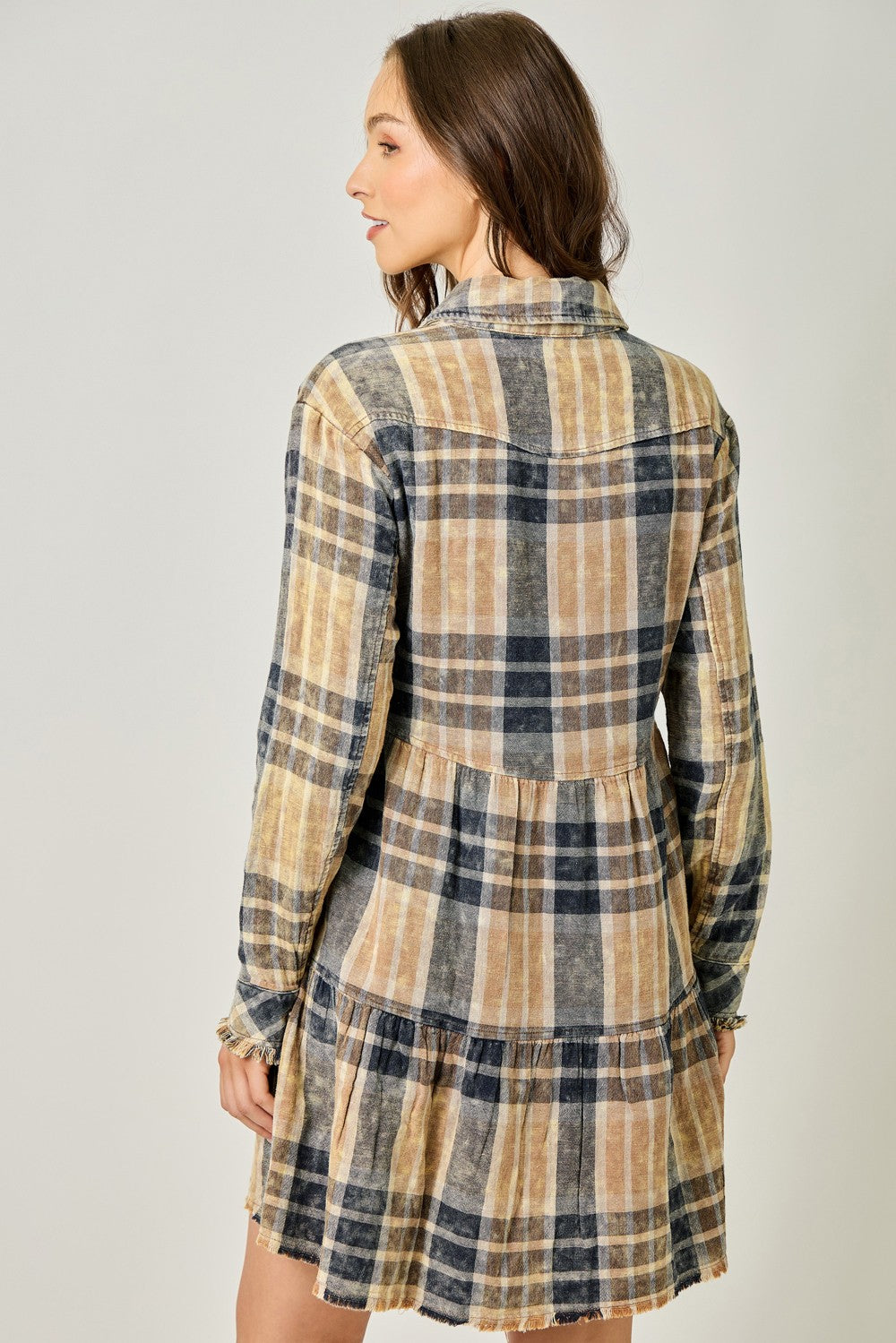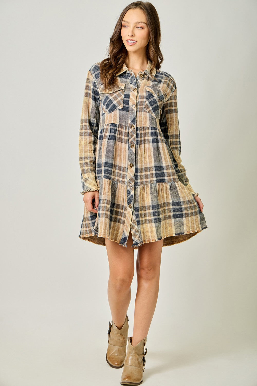 Step out in style with this acid washed tiered coat dress that’s as fun as it is fashionable. Its unique acid wash gives a cool, lived-in vibe, while the tiered layers add flouncy charm and playful movement. Perfect for making a statement no matter the occasion, this dress brings effortless edge and whimsical flair to your wardrobe.