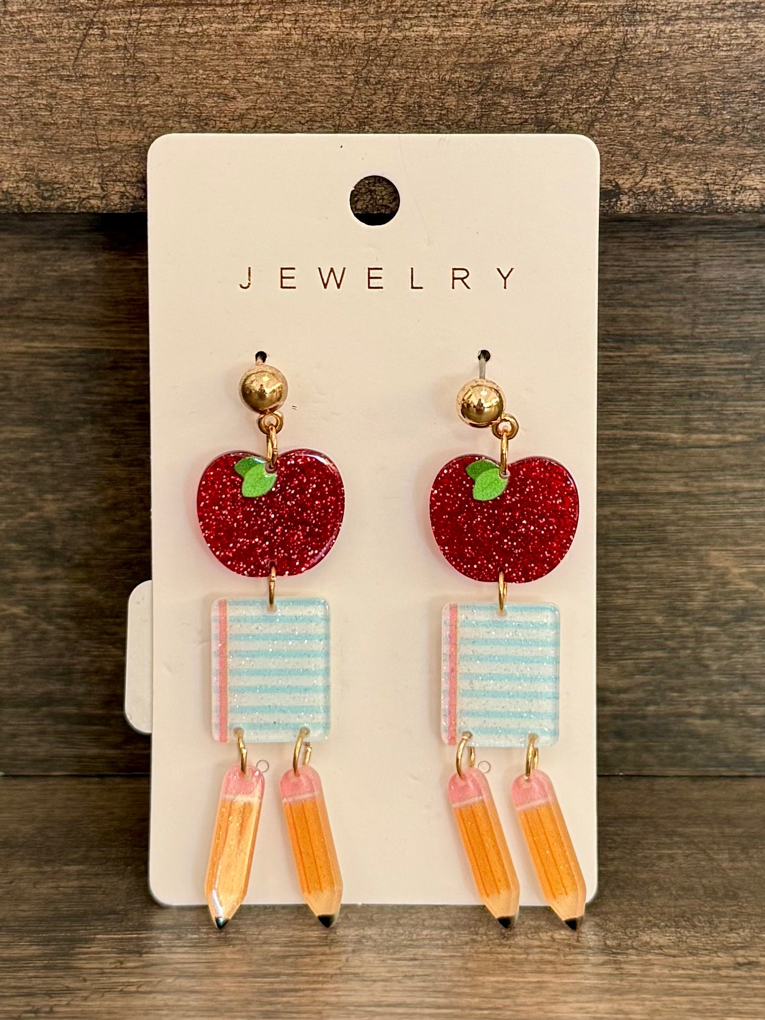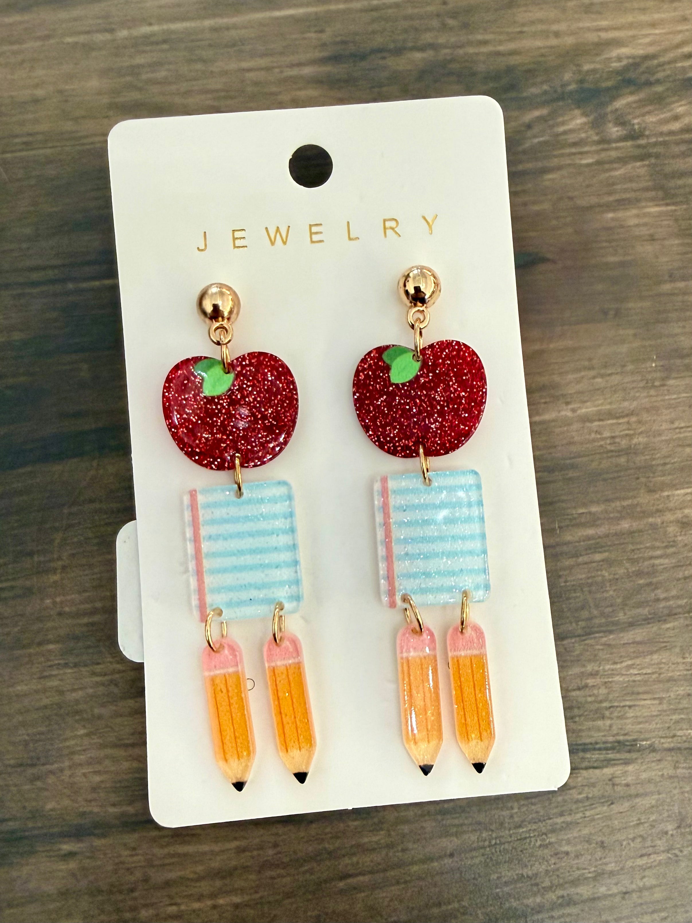 Celebrate the educators who inspire with these charming acrylic dangle earrings. Each pair features a delightful cascade of teacher-themed charms—a crisp apple, lined notebook paper, and a sharpened pencil—suspended in a graceful long dangle design. Perfect for showing appreciation to the special teachers in your life, these lightweight earrings combine playful symbolism with everyday wearability. An ideal gift for back-to-school season, teacher appreciation week, or any occasion to honor those who make a difference in the classroom.