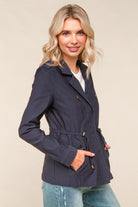 Stay effortlessly put-together in this tailored utility jacket featuring a sharp notched collar and sleek zip-up front with snap button closures. Designed for both function and flair, it includes adjustable waist drawstrings to flatter your figure and multiple pockets to keep essentials close at hand. Whether layered over denim or dressed up with tailored pants, this lightweight jacket is the perfect finishing touch for transitional weather.