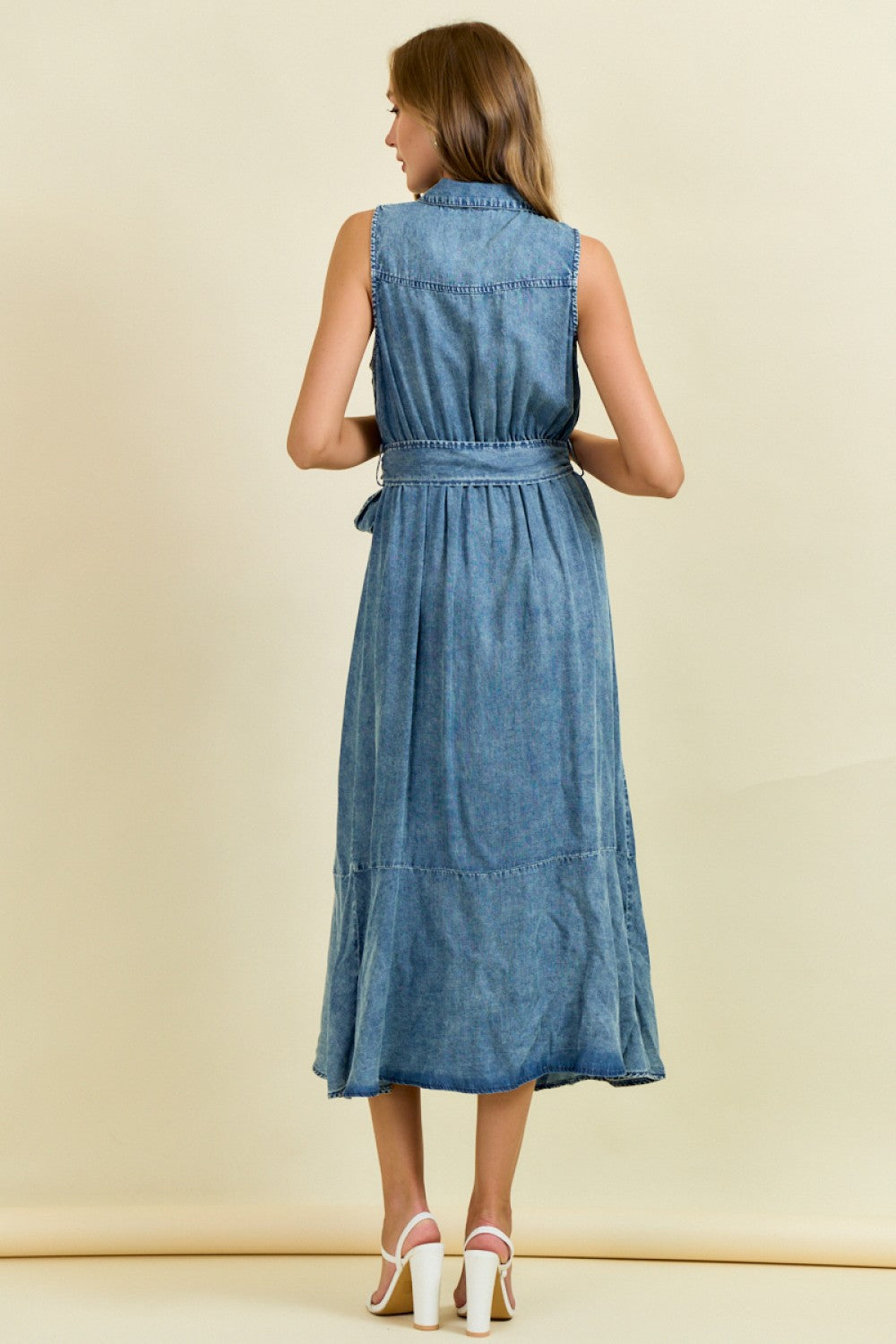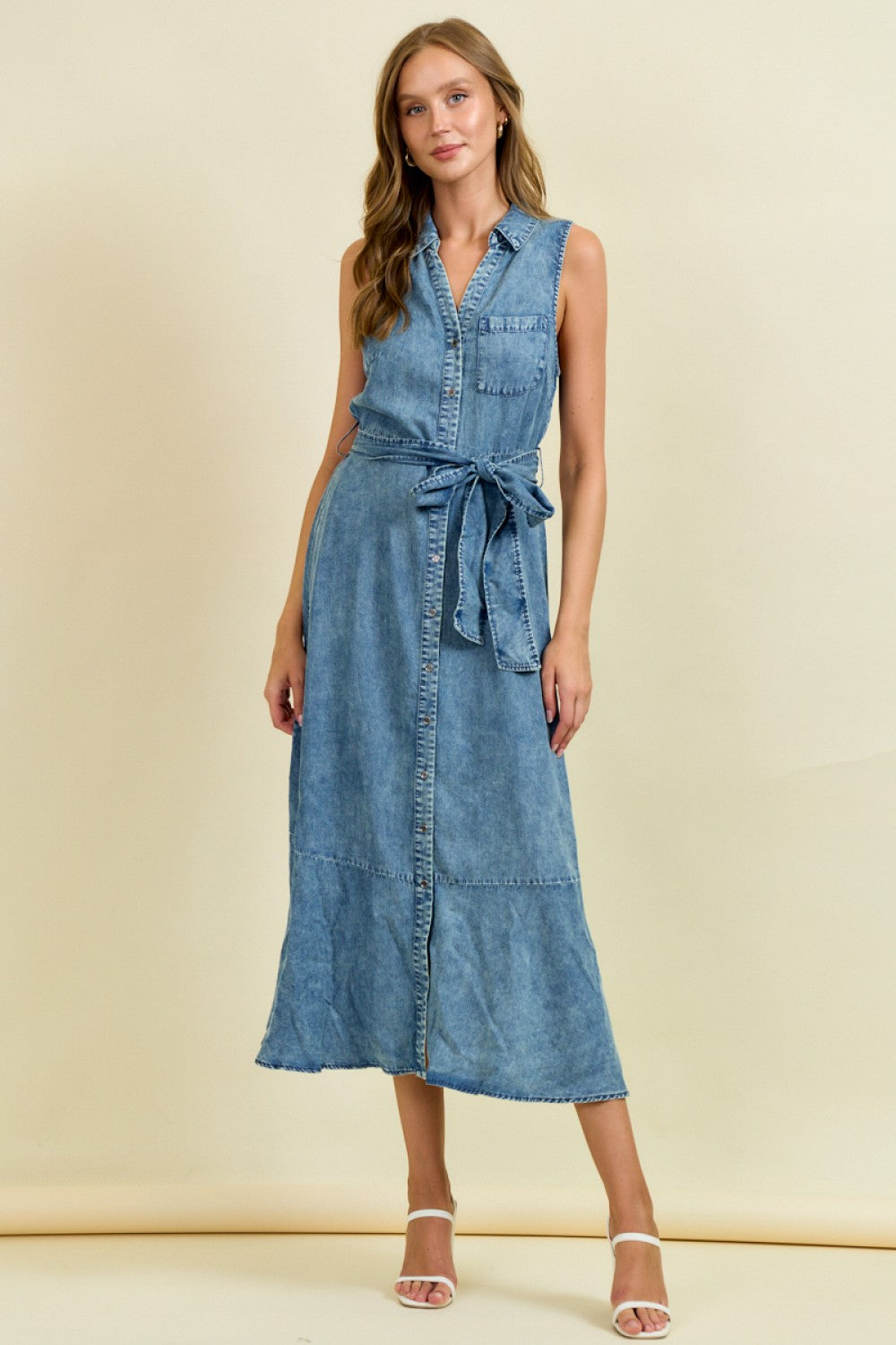 *FINAL SALE* Button Front Midi Dress With Belt And Ruffle Hem