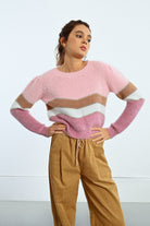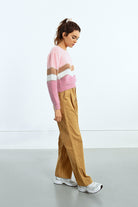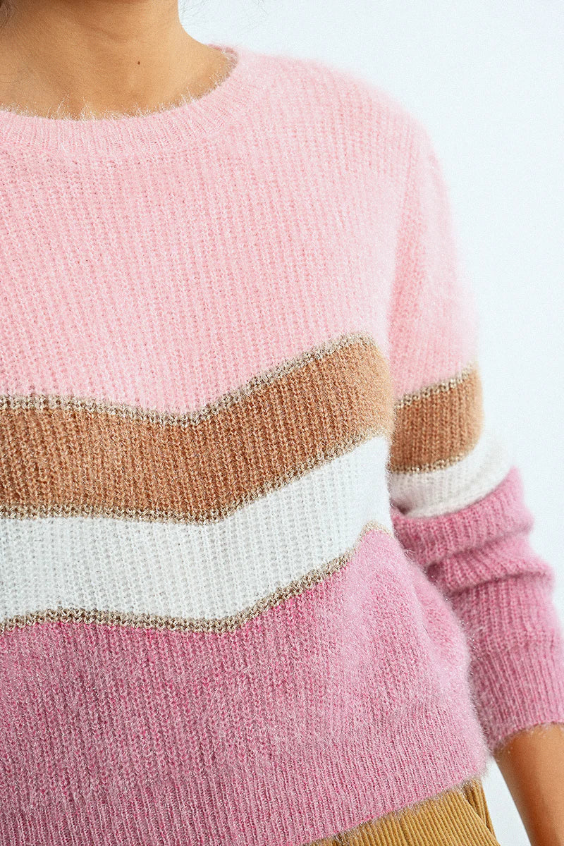 This straight-fit zigzag striped knit sweater offers a playful yet chic look, with a touch of iridescent threads that add a subtle, eye-catching shimmer to your outfit. The soft knit features long sleeves with delicately gathered shoulders, providing a feminine and modern silhouette. A classic round neckline makes it a versatile piece that can be effortlessly paired with jeans or a skirt for a stylish, everyday sparkle.