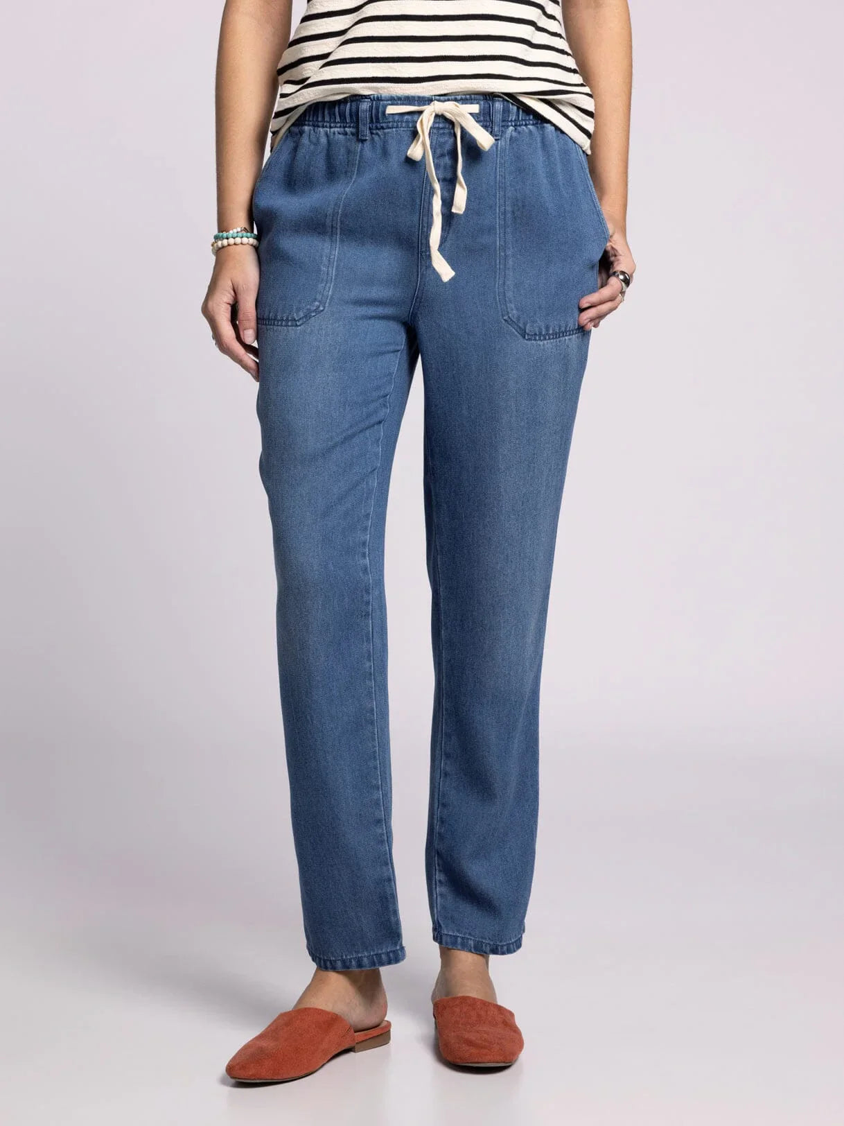 Crafted from lightweight Tencel, these straight leg pants offer effortless comfort with a breezy, relaxed fit. The adjustable drawstring waist provides a customizable fit, while side pockets add functionality. Perfect for warm-weather days or casual outings.