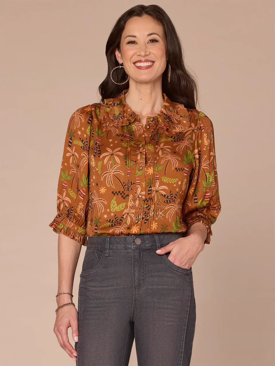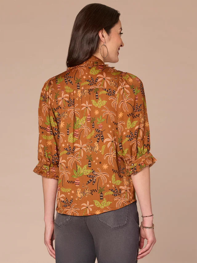 From office days to date nights, this button down woven top has your back. It features below elbow sleeves, a ruffle collar, pintuck details, and a tropical print in warm copper hues.