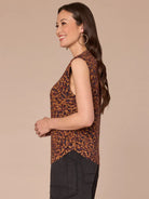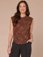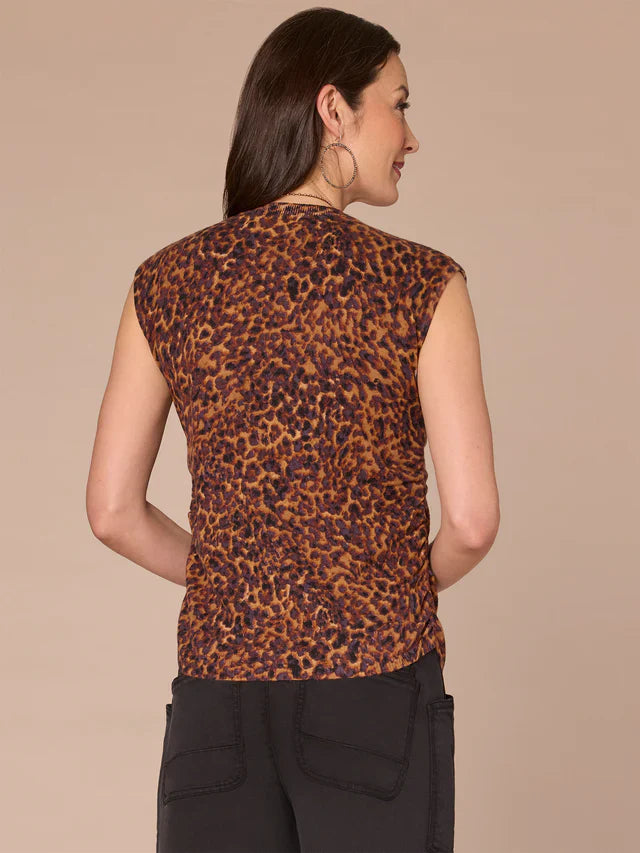 With understated details like extended shoulder sleeves, a high round neck, and a round hem, this sweater is a basic piece at first glance. However, it serves on-trend design details like side ruching and an animal print for a pop of personality.