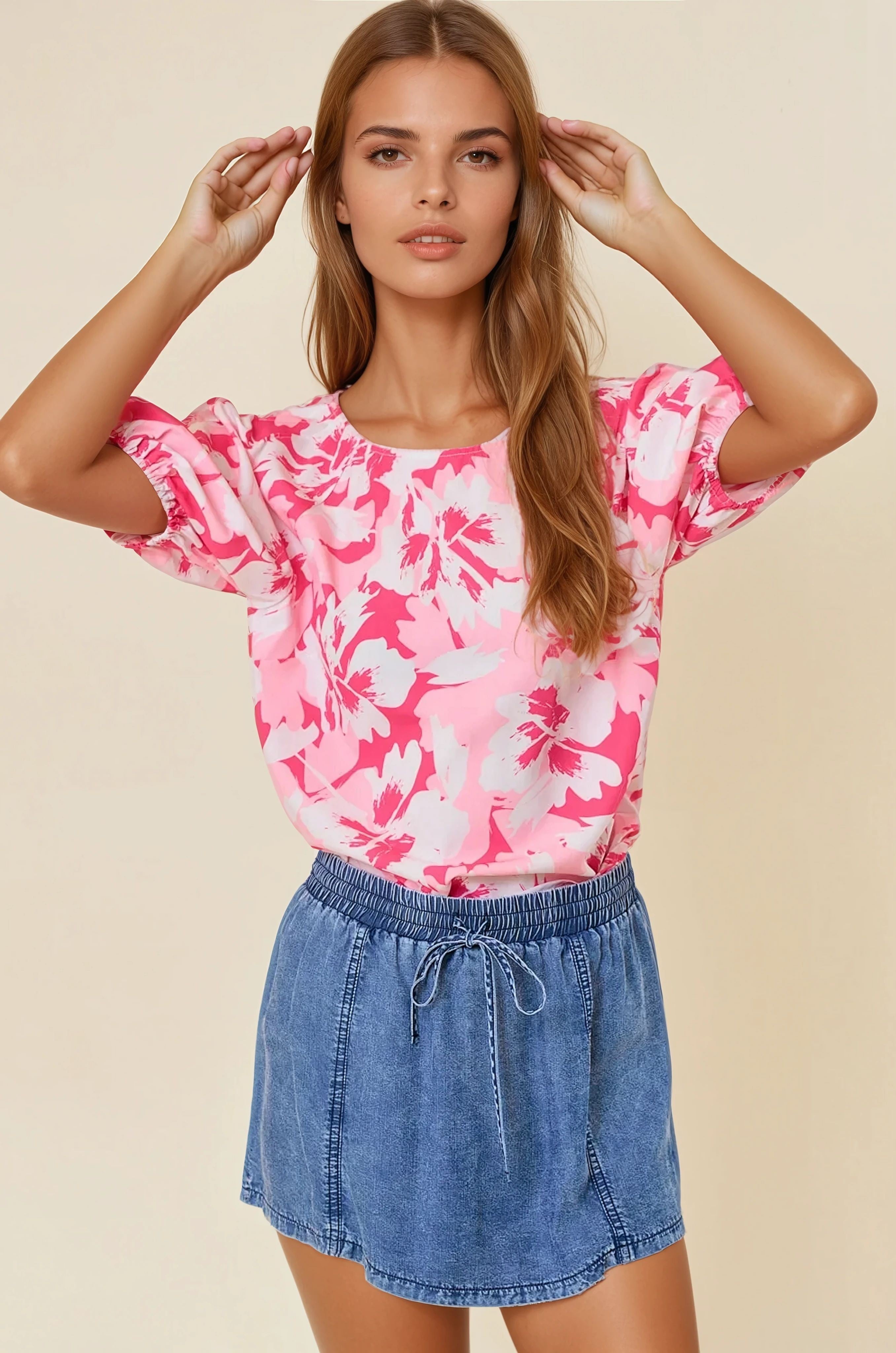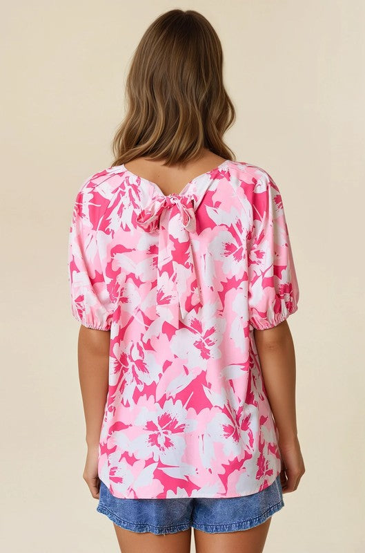 FLORAL PRINTED PIN TUCK SHORT SLEEVE TIE BACK NECK TOP - Elegant pin tuck detailing for added texture and dimension - Comfortable short puff sleeves with elastic cuffs - Flattering round neckline with tie back closure - Lightweight, flowy fabric perfect for spring and summer