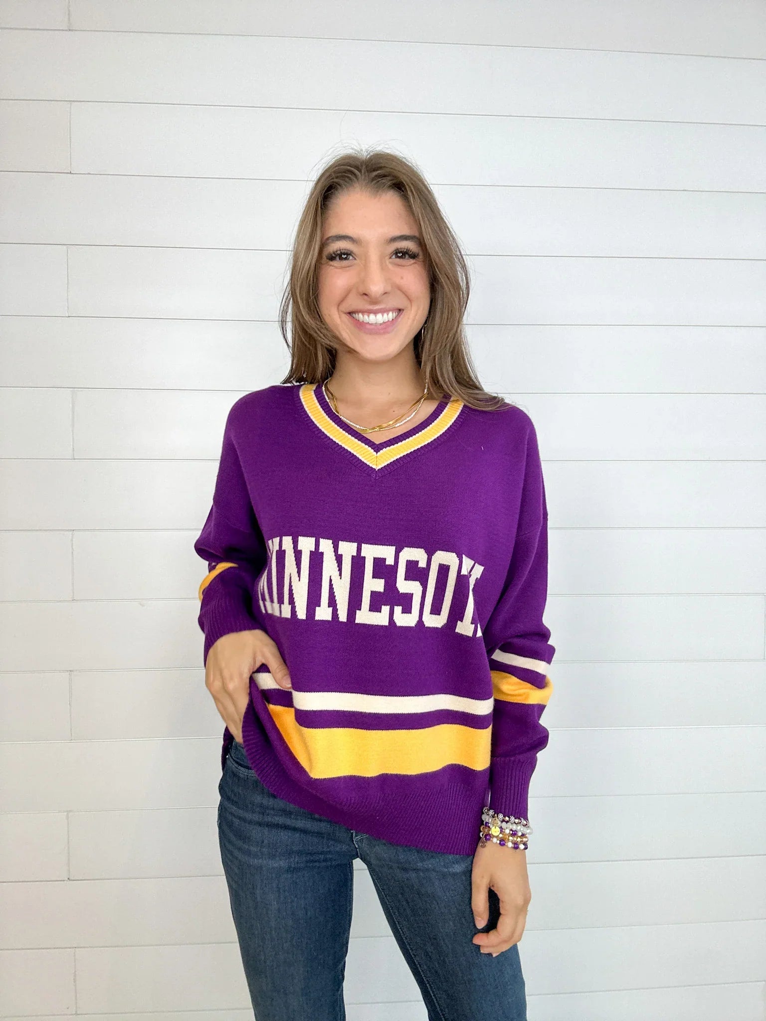 Show your team pride with the “Minnesota” Varsity Stripe Sweater—featuring a flattering V-neck and classic stripe details at the neckline, elbows, and waist. Whether you’re repping the Pros or the College Boys, this sweater brings a fabulous feel and top-tier quality in every stitch. Perfect for game day or just adding sporty flair to your everyday look.