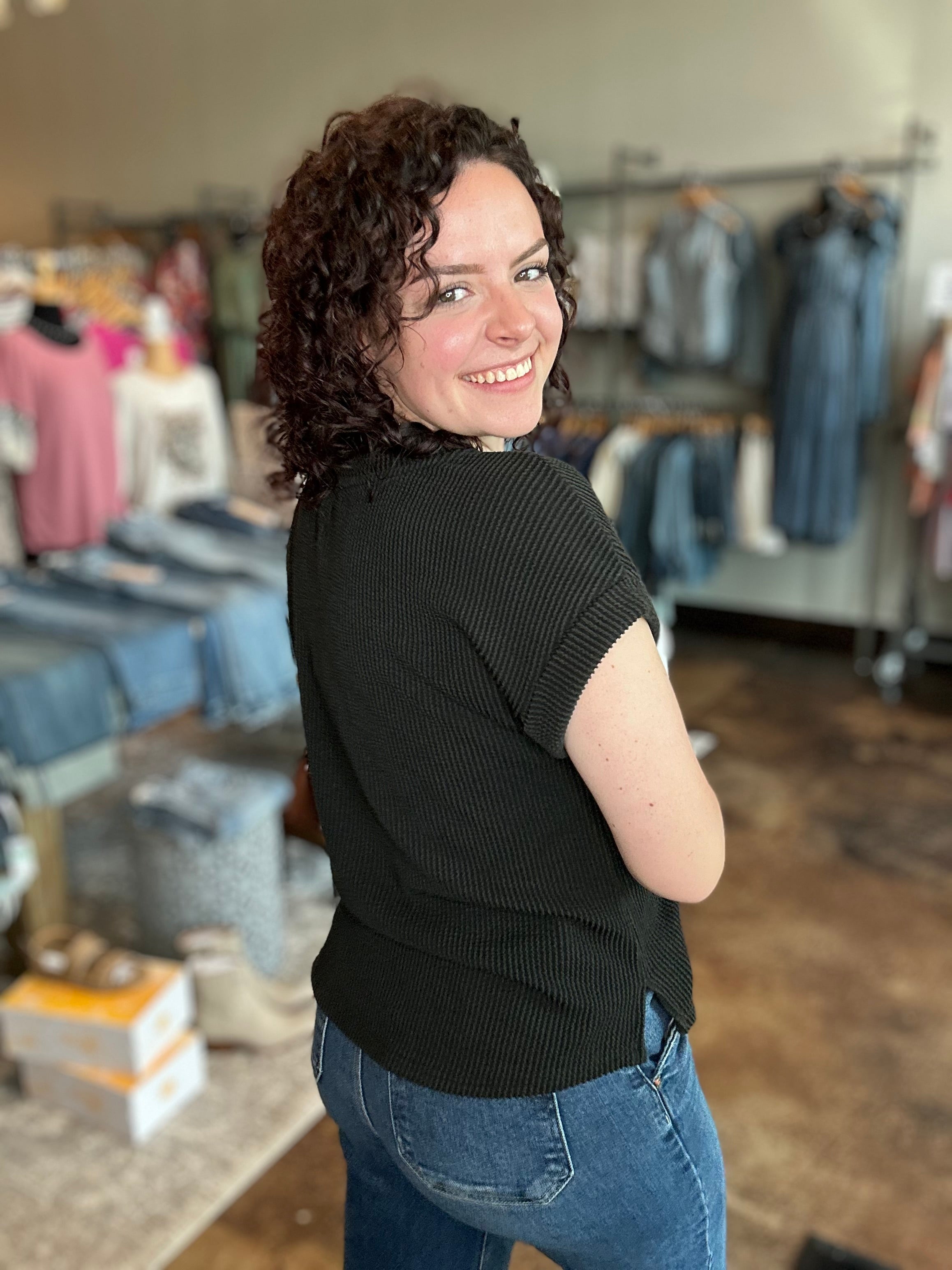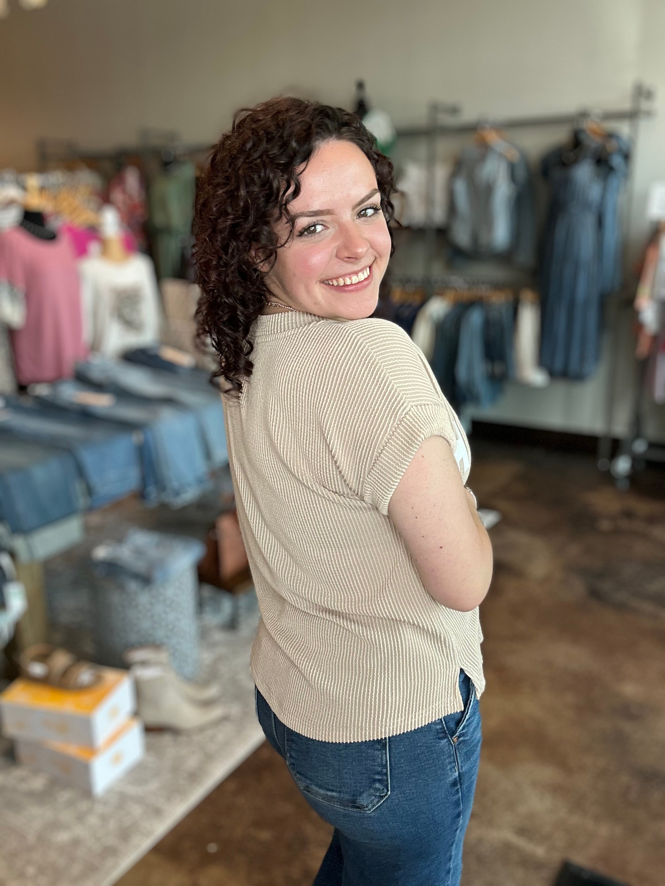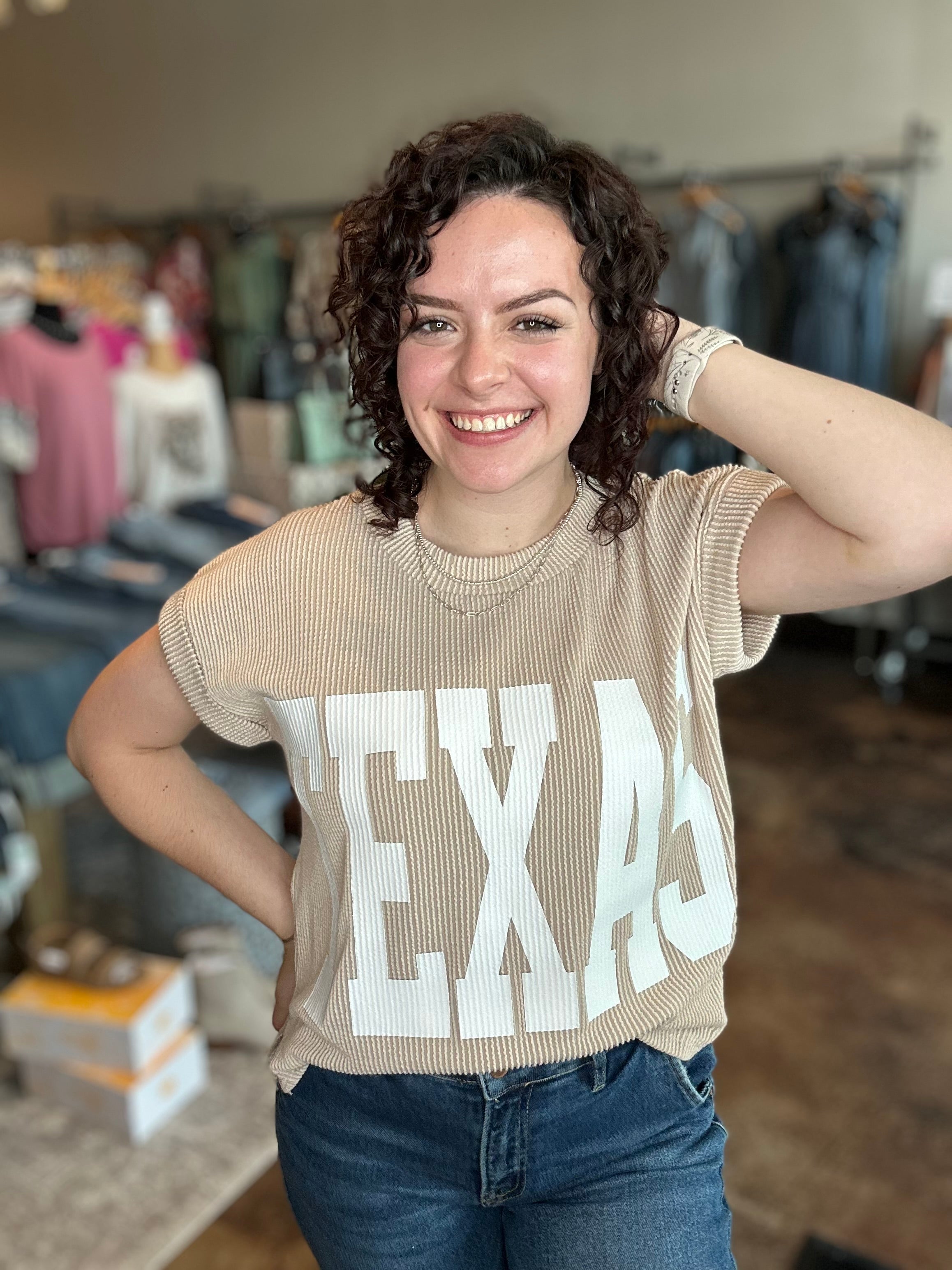 Introducing your perfect blend of relaxed charm and Lone Star pride: the 'TEXAS' Graphic Ribbed Knit Top. This effortlessly stylish top features a gentle round neckline and casually sloped drop shoulders that create a cozy, laid-back silhouette. Crafted in a soft sweater-knit fabric, it offers breathable warmth and a plush texture that elevates the classic tee look. The relaxed fit ensures easy movement and year-round versatility, while the bold Texas motif gives a nod to regional flair. Whether paired with your favorite jeans or elevated with chic layers for cooler evenings, this ribbed knit top brings polished comfort and spirited design to your everyday wardrobe.