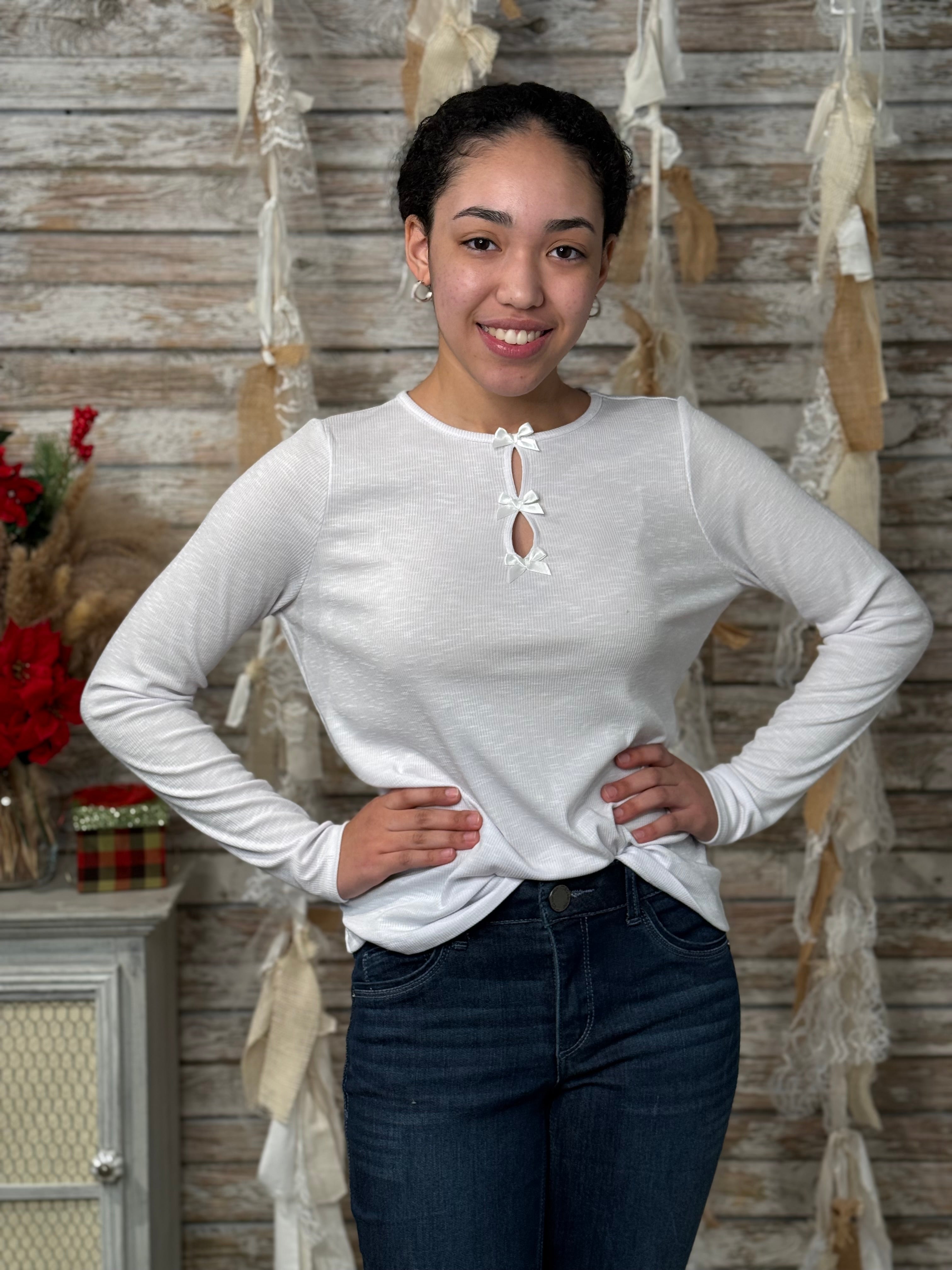 This women’s keyhole neck top adds a polished twist to a classic long sleeve tee. Made from a soft slub knit fabric, it offers lightweight comfort with a subtly textured look. The neckline features three keyhole cutouts accented with satin tape, giving the top a touch of elegance while keeping it easy for everyday wear.