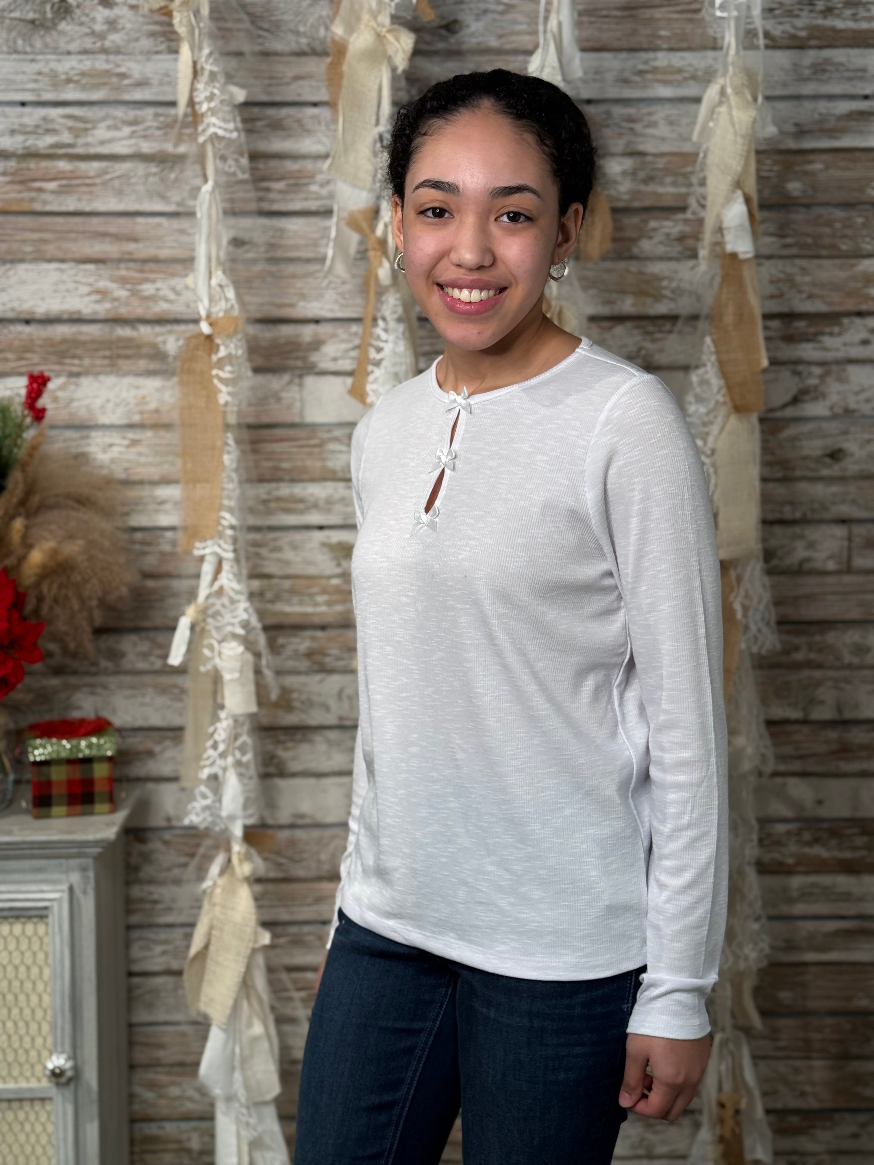 Women’s Keyhole Neck Top – Satin Trim Long Sleeve Slub Knit Tee