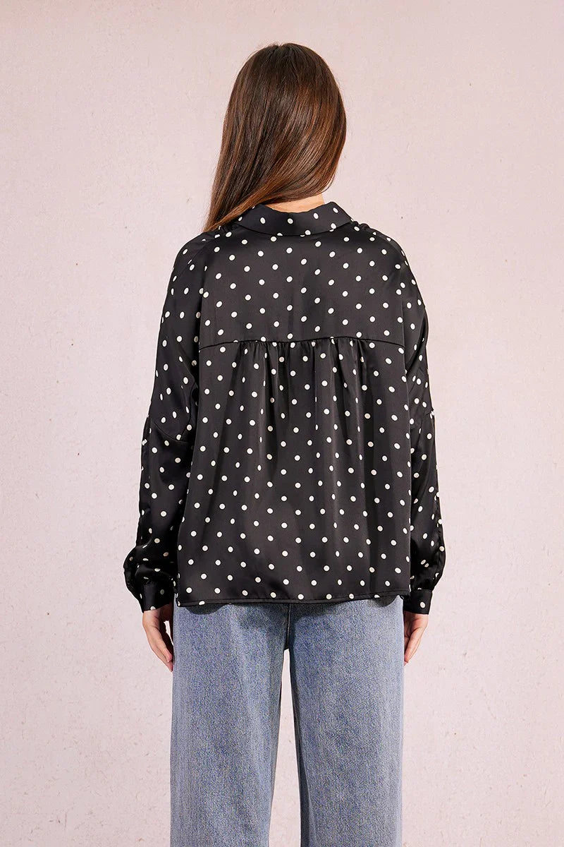 Crisp polka dot woven shirt with a relaxed silhouette. Features low armholes for ease of movement, long sleeves with buttoned cuffs, and a classic collar. Front button closure with a straight, cropped cut that works effortlessly from desk to dinner.