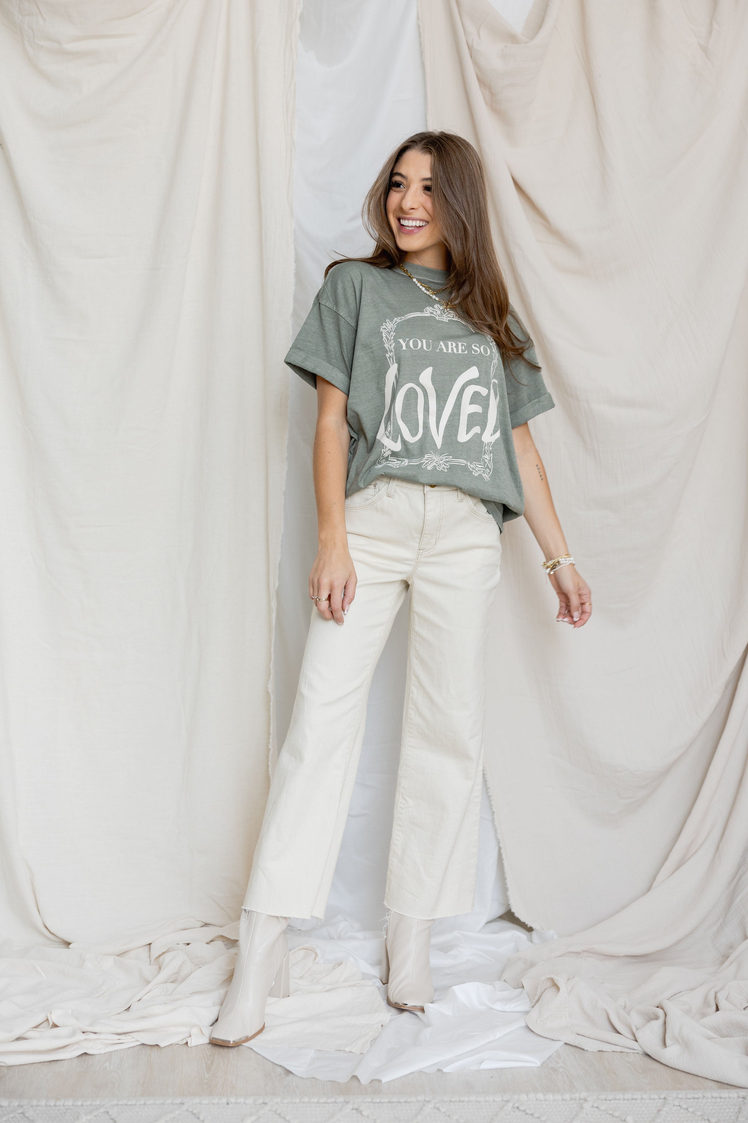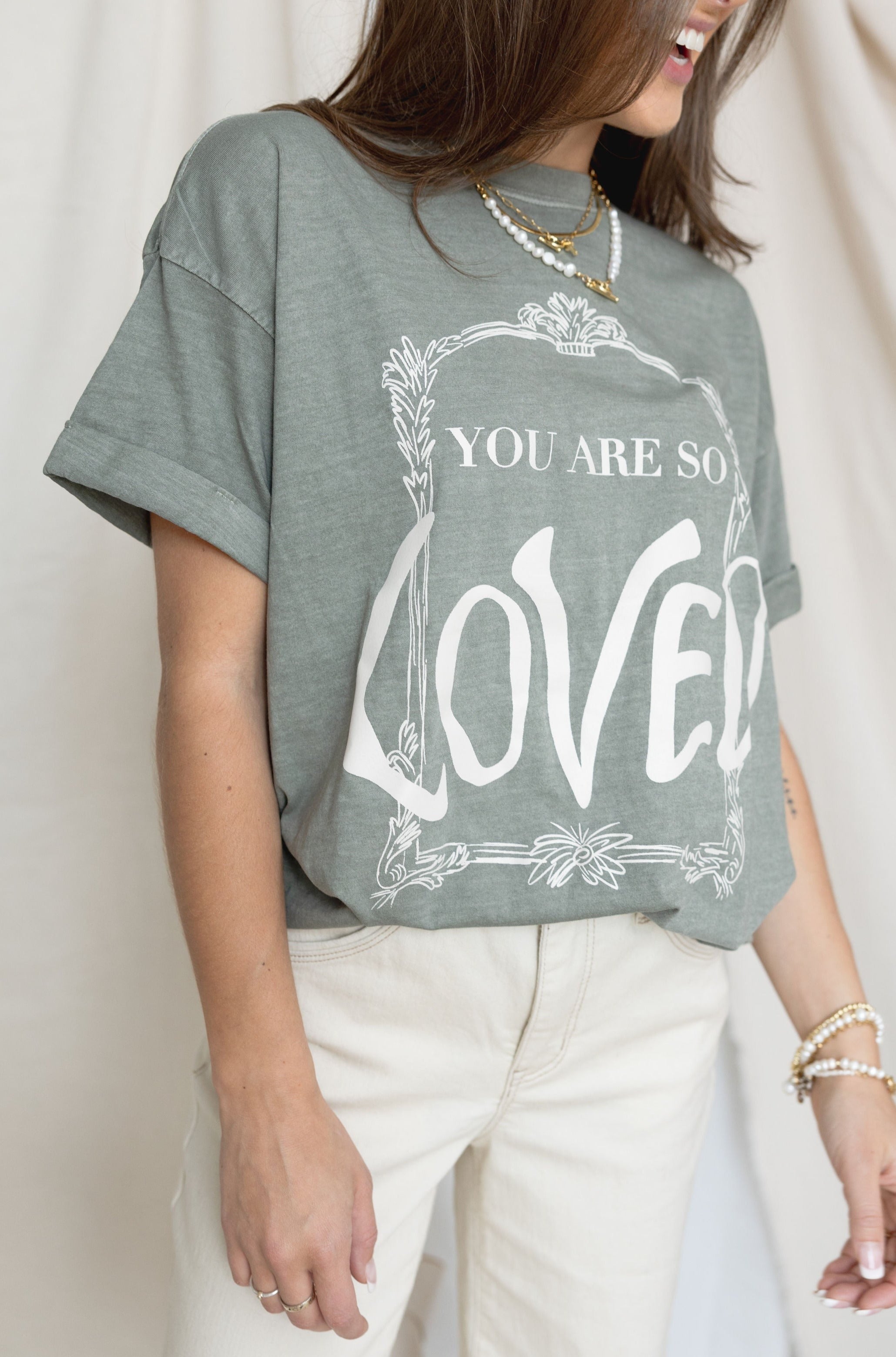 Our graphic tees are 100% cotton, and are oh-so-soft. Featuring rolled sleeves and a boyfriend fit, our graphic tees will quickly become something you’re reaching for daily! Internal neck tag says “you are so loved” - so you remember how loved you are every time you get dressed.